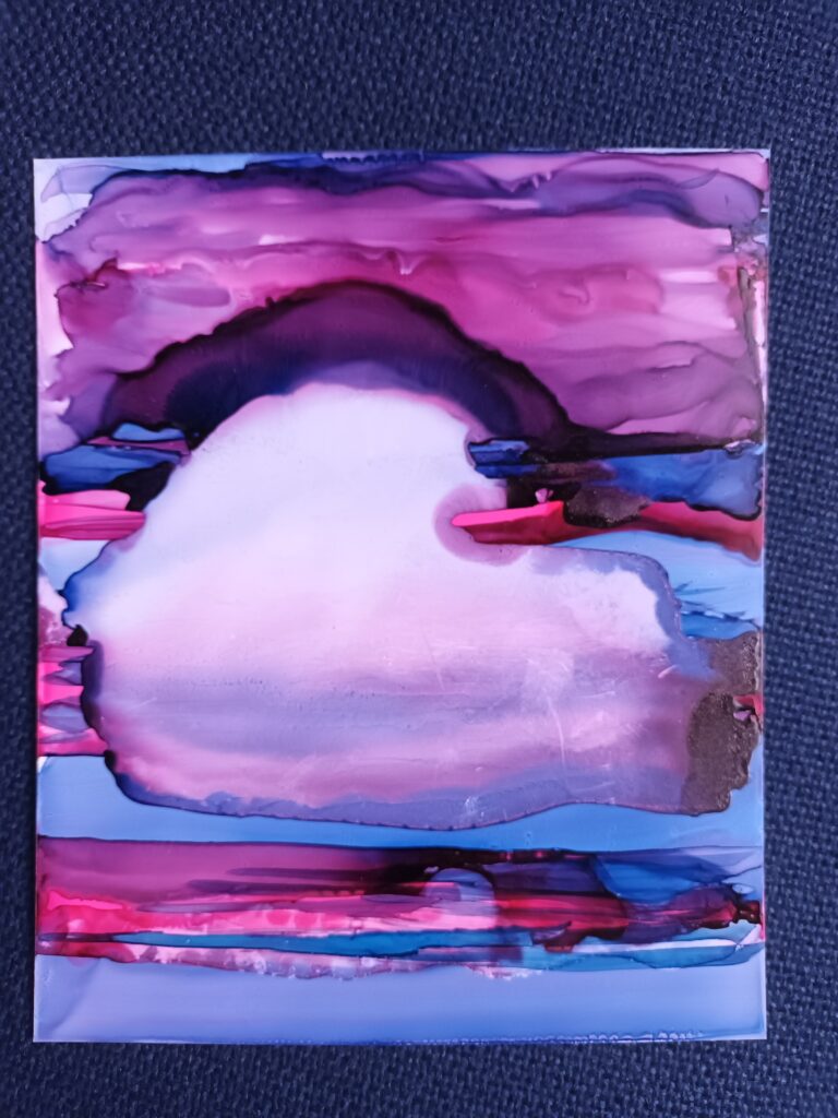 During the 2023 evening class, I created several pieces using alcohol inks , including a circular framed piece and a small decorative piece.